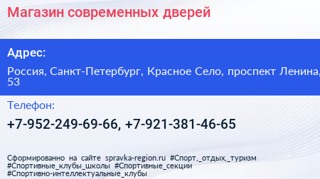 Магазин современных дверей по адресу Россия, Санкт-Петербург, Красное Село, проспект Ленина, 53 в дальнейшем Организация, размещена в следующих категориях:
