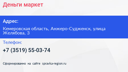 Деньги маркет по адресу Кемеровская область, Анжеро-Судженск, улица Желябова, 3 в дальнейшем Организация, размещена в следующих категориях: