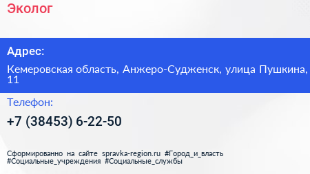 Эколог по адресу Кемеровская область, Анжеро-Судженск, улица Пушкина, 11 в дальнейшем Организация, размещена в следующих категориях:
