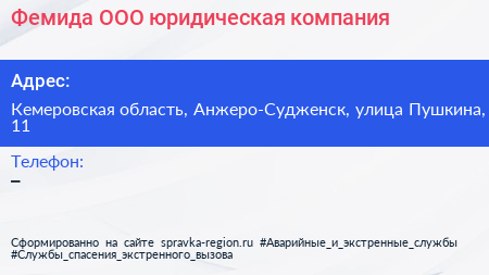 Фемида, ООО, юридическая компания по адресу Кемеровская область, Анжеро-Судженск, улица Пушкина, 11 в дальнейшем Организация, размещена в следующих категориях: