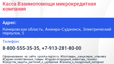 Касса Взаимопомощи, микрокредитная компания по адресу Кемеровская область, Анжеро-Судженск, Электрический переулок, 5 в дальнейшем Организация, размещена в следующих категориях:
