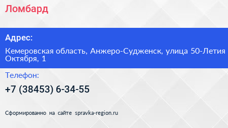 Ломбард по адресу Кемеровская область, Анжеро-Судженск, улица 50-Летия Октября, 1 в дальнейшем Организация, размещена в следующих категориях: