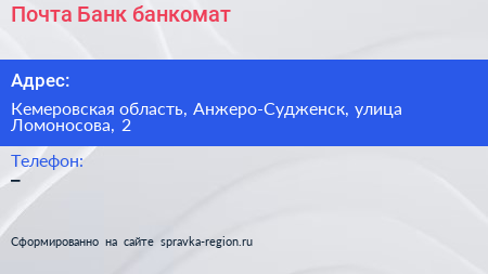 Почта Банк, банкомат по адресу Кемеровская область, Анжеро-Судженск, улица Ломоносова, 2 в дальнейшем Организация, размещена в следующих категориях: