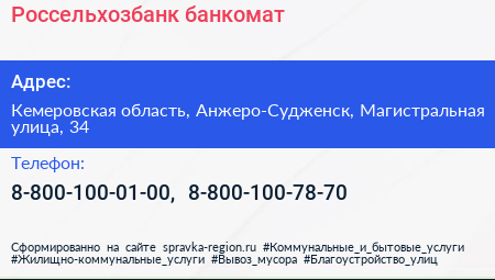 Россельхозбанк, банкомат по адресу Кемеровская область, Анжеро-Судженск, Магистральная улица, 34 в дальнейшем Организация, размещена в следующих категориях: