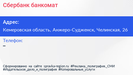 Сбербанк, банкомат по адресу Кемеровская область, Анжеро-Судженск, Челинская, 26 в дальнейшем Организация, размещена в следующих категориях: