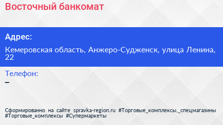 Восточный, банкомат по адресу Кемеровская область, Анжеро-Судженск, улица Ленина, 22 в дальнейшем Организация, размещена в следующих категориях: