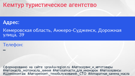 Кемтур, туристическое агентство по адресу Кемеровская область, Анжеро-Судженск, Дорожная улица, 39 в дальнейшем Организация, размещена в следующих категориях: