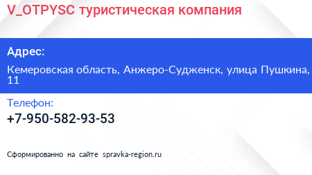 V_OTPYSC, туристическая компания по адресу Кемеровская область, Анжеро-Судженск, улица Пушкина, 11 в дальнейшем Организация, размещена в следующих категориях: