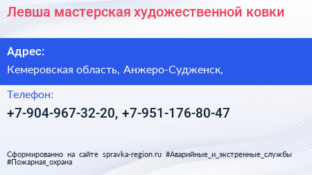 Левша, мастерская художественной ковки по адресу Кемеровская область, Анжеро-Судженск, в дальнейшем Организация, размещена в следующих категориях: