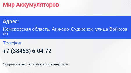 Мир Аккумуляторов по адресу Кемеровская область, Анжеро-Судженск, улица Войкова, 6а в дальнейшем Организация, размещена в следующих категориях: