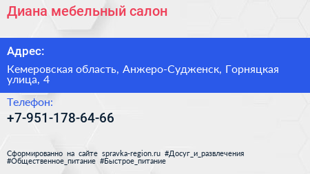 Диана, мебельный салон по адресу Кемеровская область, Анжеро-Судженск, Горняцкая улица, 4 в дальнейшем Организация, размещена в следующих категориях: