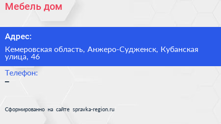 Мебель дом по адресу Кемеровская область, Анжеро-Судженск, Кубанская улица, 46 в дальнейшем Организация, размещена в следующих категориях: