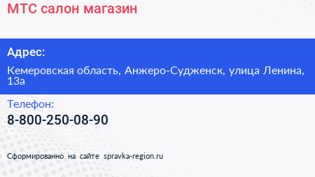 МТС, салон-магазин по адресу Кемеровская область, Анжеро-Судженск, улица Ленина, 13а в дальнейшем Организация, размещена в следующих категориях: