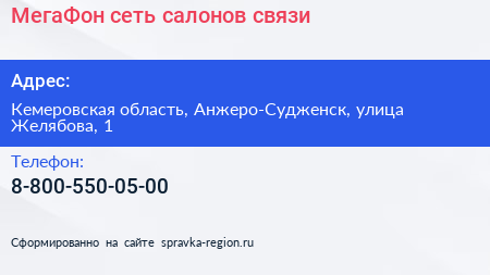 МегаФон, сеть салонов связи по адресу Кемеровская область, Анжеро-Судженск, улица Желябова, 1 в дальнейшем Организация, размещена в следующих категориях: