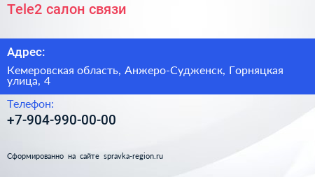 Tele2, салон связи по адресу Кемеровская область, Анжеро-Судженск, Горняцкая улица, 4 в дальнейшем Организация, размещена в следующих категориях: