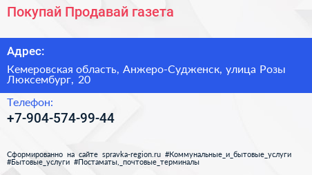 Покупай Продавай, газета по адресу Кемеровская область, Анжеро-Судженск, улица Розы Люксембург, 20 в дальнейшем Организация, размещена в следующих категориях: