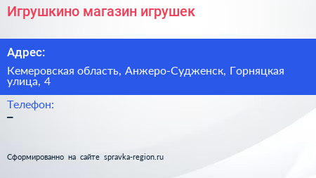 Игрушкино, магазин игрушек по адресу Кемеровская область, Анжеро-Судженск, Горняцкая улица, 4 в дальнейшем Организация, размещена в следующих категориях: