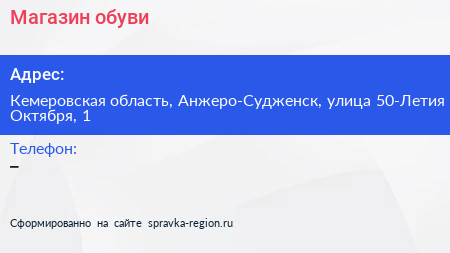 Магазин обуви по адресу Кемеровская область, Анжеро-Судженск, улица 50-Летия Октября, 1 в дальнейшем Организация, размещена в следующих категориях: