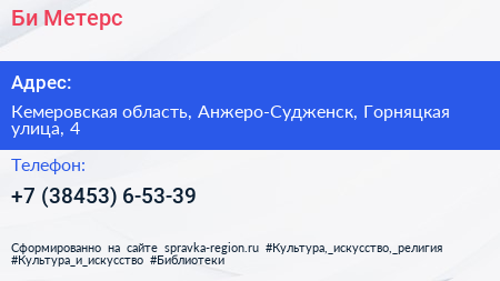 Би Метерс по адресу Кемеровская область, Анжеро-Судженск, Горняцкая улица, 4 в дальнейшем Организация, размещена в следующих категориях: