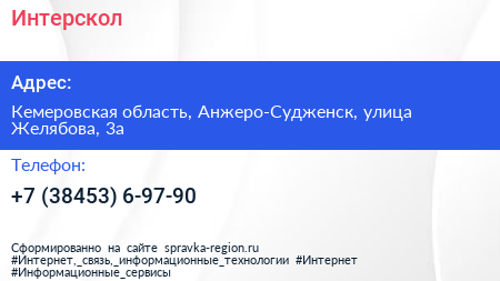 Интерскол по адресу Кемеровская область, Анжеро-Судженск, улица Желябова, 3а в дальнейшем Организация, размещена в следующих категориях: