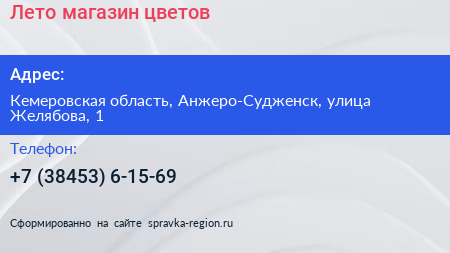 Лето, магазин цветов по адресу Кемеровская область, Анжеро-Судженск, улица Желябова, 1 в дальнейшем Организация, размещена в следующих категориях: