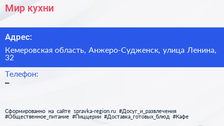 Мир кухни по адресу Кемеровская область, Анжеро-Судженск, улица Ленина, 32 в дальнейшем Организация, размещена в следующих категориях: