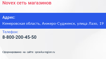 Novex, сеть магазинов по адресу Кемеровская область, Анжеро-Судженск, улица Лазо, 19 в дальнейшем Организация, размещена в следующих категориях: