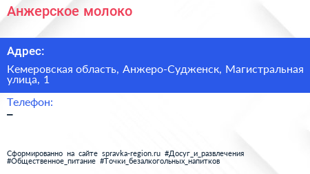 Анжерское молоко по адресу Кемеровская область, Анжеро-Судженск, Магистральная улица, 1 в дальнейшем Организация, размещена в следующих категориях: