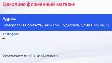 Ермолино, фирменный магазин по адресу Кемеровская область, Анжеро-Судженск, улица Мира, 16 в дальнейшем Организация, размещена в следующих категориях: