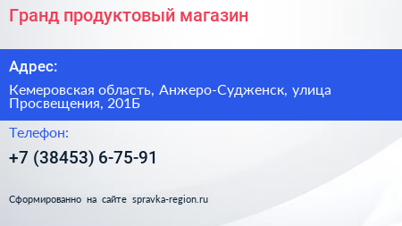 Гранд, продуктовый магазин по адресу Кемеровская область, Анжеро-Судженск, улица Просвещения, 201Б в дальнейшем Организация, размещена в следующих категориях: