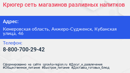 Крюгер, сеть магазинов разливных напитков по адресу Кемеровская область, Анжеро-Судженск, Кубанская улица, 46 в дальнейшем Организация, размещена в следующих категориях: