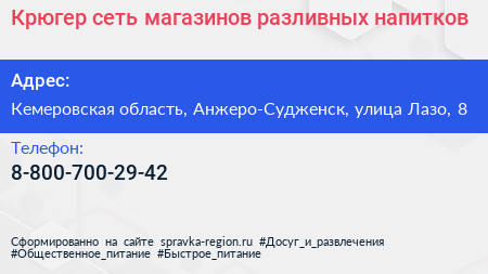 Крюгер, сеть магазинов разливных напитков по адресу Кемеровская область, Анжеро-Судженск, улица Лазо, 8 в дальнейшем Организация, размещена в следующих категориях: