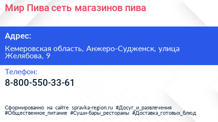 Мир Пива, сеть магазинов пива по адресу Кемеровская область, Анжеро-Судженск, улица Желябова, 9 в дальнейшем Организация, размещена в следующих категориях: