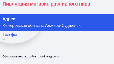 Пивляндия, магазин разливного пива по адресу Кемеровская область, Анжеро-Судженск, в дальнейшем Организация, размещена в следующих категориях: