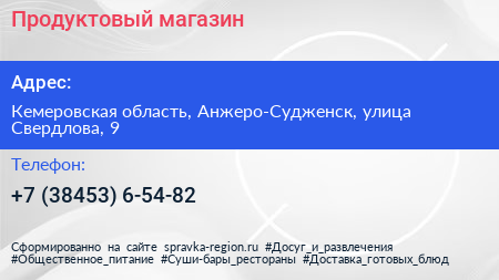 Продуктовый магазин по адресу Кемеровская область, Анжеро-Судженск, улица Свердлова, 9 в дальнейшем Организация, размещена в следующих категориях: