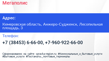 Мегаполис по адресу Кемеровская область, Анжеро-Судженск, Лесопильная площадь, 3 в дальнейшем Организация, размещена в следующих категориях: