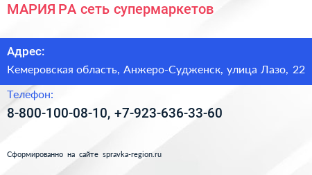 МАРИЯ-РА, сеть супермаркетов по адресу Кемеровская область, Анжеро-Судженск, улица Лазо, 22 в дальнейшем Организация, размещена в следующих категориях: