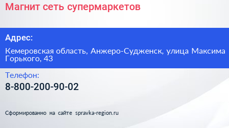 Магнит, сеть супермаркетов по адресу Кемеровская область, Анжеро-Судженск, улица Максима Горького, 43 в дальнейшем Организация, размещена в следующих категориях: