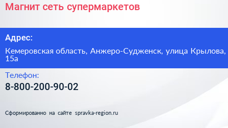 Магнит, сеть супермаркетов по адресу Кемеровская область, Анжеро-Судженск, улица Крылова, 15а в дальнейшем Организация, размещена в следующих категориях: