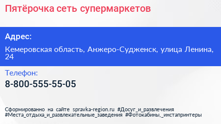 Пятёрочка, сеть супермаркетов по адресу Кемеровская область, Анжеро-Судженск, улица Ленина, 24 в дальнейшем Организация, размещена в следующих категориях: