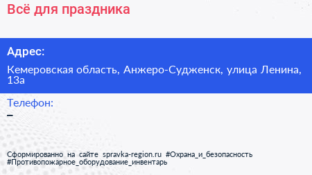 Всё для праздника по адресу Кемеровская область, Анжеро-Судженск, улица Ленина, 13а в дальнейшем Организация, размещена в следующих категориях: