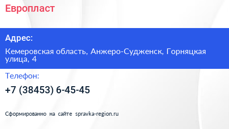 Европласт по адресу Кемеровская область, Анжеро-Судженск, Горняцкая улица, 4 в дальнейшем Организация, размещена в следующих категориях: