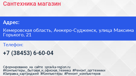 Сантехника, магазин по адресу Кемеровская область, Анжеро-Судженск, улица Максима Горького, 21 в дальнейшем Организация, размещена в следующих категориях: