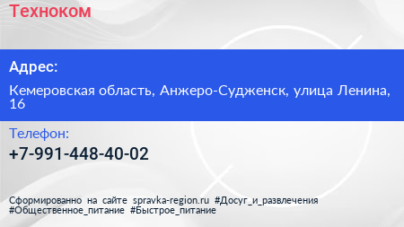 Техноком по адресу Кемеровская область, Анжеро-Судженск, улица Ленина, 16 в дальнейшем Организация, размещена в следующих категориях: