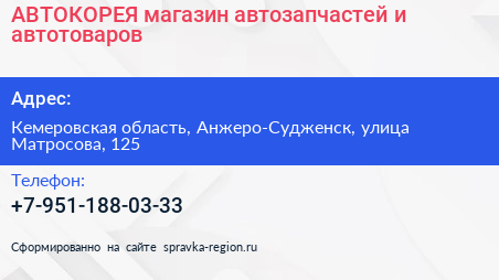 АВТОКОРЕЯ, магазин автозапчастей и автотоваров по адресу Кемеровская область, Анжеро-Судженск, улица Матросова, 125 в дальнейшем Организация, размещена в следующих категориях: