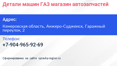 Детали машин ГАЗ, магазин автозапчастей по адресу Кемеровская область, Анжеро-Судженск, Гаражный переулок, 2 в дальнейшем Организация, размещена в следующих категориях: