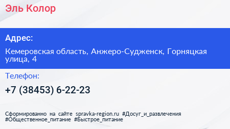 Эль-Колор по адресу Кемеровская область, Анжеро-Судженск, Горняцкая улица, 4 в дальнейшем Организация, размещена в следующих категориях: