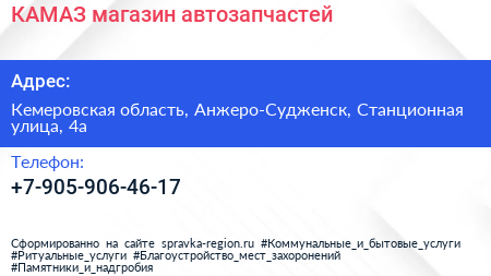 КАМАЗ, магазин автозапчастей по адресу Кемеровская область, Анжеро-Судженск, Станционная улица, 4а в дальнейшем Организация, размещена в следующих категориях: