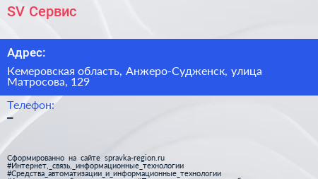 SV Сервис по адресу Кемеровская область, Анжеро-Судженск, улица Матросова, 129 в дальнейшем Организация, размещена в следующих категориях: