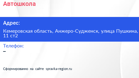 Автошкола по адресу Кемеровская область, Анжеро-Судженск, улица Пушкина, 11 ст2 в дальнейшем Организация, размещена в следующих категориях: